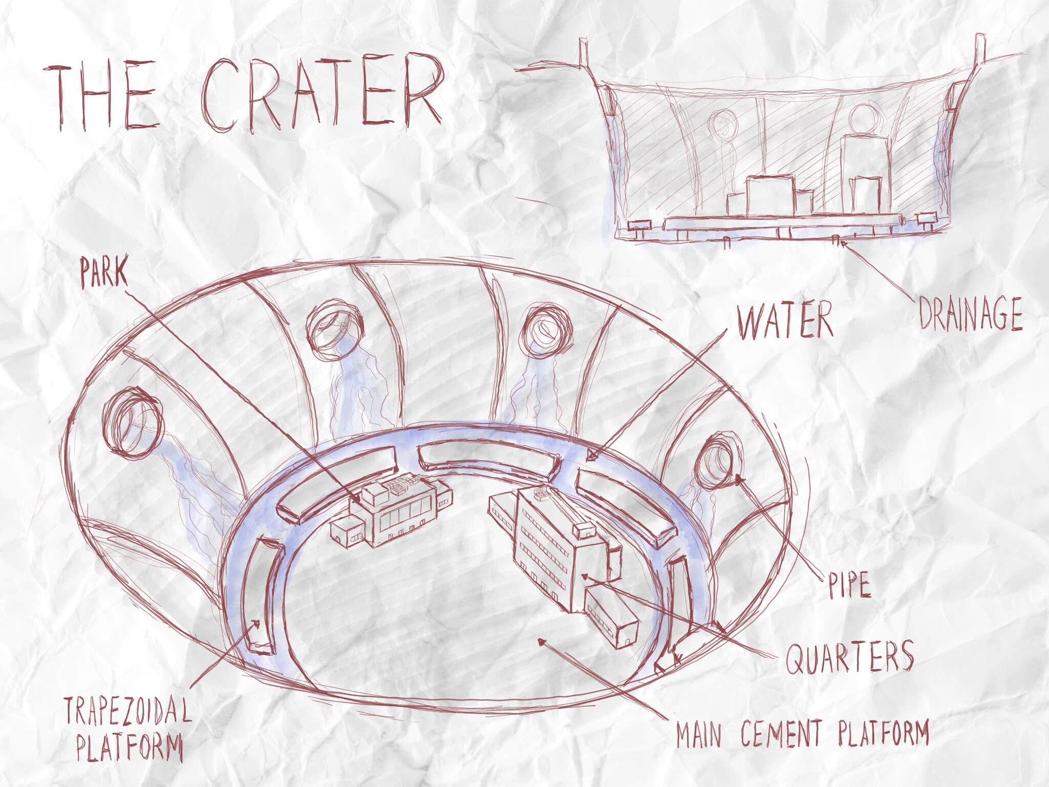 ●●●ㅤㅤI can hear water flowing—it's such a calming sound. I can hear young children playing—it's a nice contrast to the sound of flowing water. As my eyes start to gain focus, I get a better look at where I am.ㅤㅤI'm laying on my back looking up directly at the sky. I'd say it’s a pretty scene, but it’s overshadowed by a large circle. Actually, the sky itself is a circle.ㅤㅤI gain my composure and sit up.ㅤㅤ"Come on, Jeem! Get up!" says a young boy, helping me up.ㅤㅤ"Sorry, Yusuf. I didn't mean to doze off," I reply.ㅤㅤYusuf just smiles with his hands behind his back. I look around.ㅤㅤI'm inside a ginormous crater. Below ground level and standing on a circular gray platform the size of at least two football fields. The top edges of the crater, where the ground level is, seems to be around eight stories tall.ㅤㅤWhat’s particular about this dome is the running water—there are six large pipes sticking out from the sides of the crater. The reason I call the gigantic thing I'm standing on a ‘platform’ is because . . . we're on water. Almost like a circular cement-island. The pipes seem to be supplying filtered water to the crater. Mind you, the body of water underneath us is very shallow. Probably would reach just a little above your ankles. I can’t see exactly where the water is drained to.ㅤㅤPositioned around the circular platform are multiple, smaller, trapezoidal platforms. Kids are playing either on the platform or in the shallow water. There are also two large buildings off in the distance, where I assume more children are.