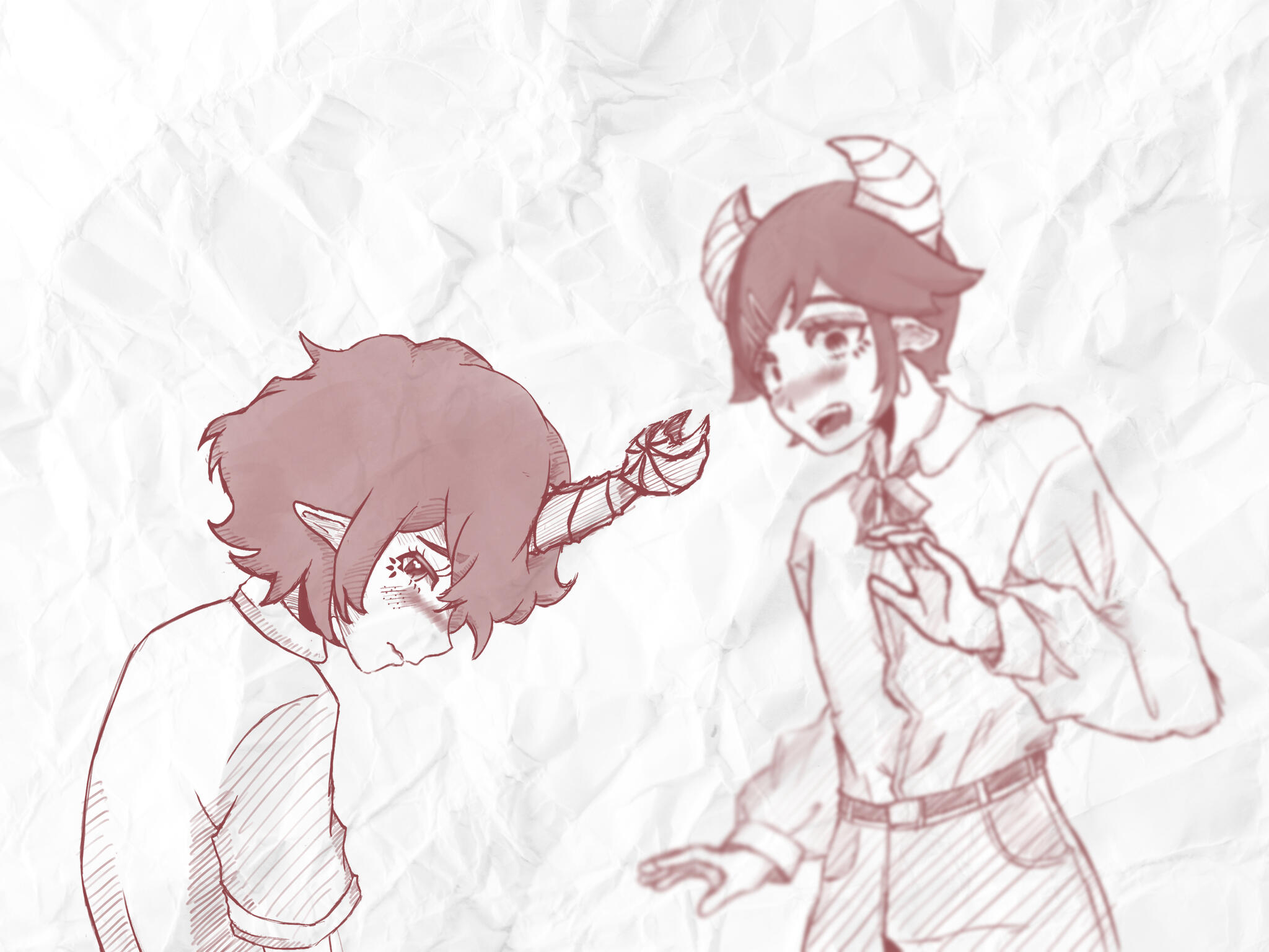 ㅤㅤ“I . . . left my phone,” I say as I pick it up off the shelf where I left it, “By the way, th—the wifi is JJWifi and the password is ontib46. No caps or spaces.”ㅤㅤ“O—oh! Thanks. Thanks. Yeah,” She responds.ㅤㅤ“Eyup,” I say, also trying to seem casual, “Well. Talk to you later!”ㅤㅤI begin to walk out, but suddenly feel a tug on my shirt.ㅤㅤ“Um. Please don’t tell—“ㅤㅤ“I didn’t see anything,” I interrupt as I turn around and look at her.ㅤㅤ“ . . . ”ㅤㅤShe is beet red. She tilts her head, leans on my chest, and softly taps her singular forehead horn onto my neck. She quickly steps back.ㅤㅤ“Thanks. Please don’t think anything different of me,” she says.ㅤㅤ“No worries,” I reassure her. Holy shit. What the fuck is happening right now.ㅤㅤA few moments of silence.